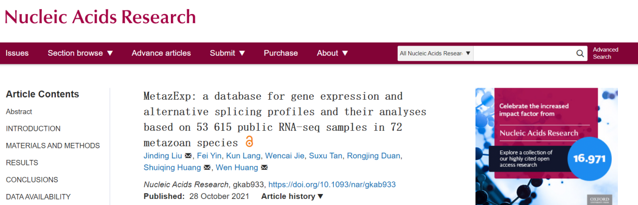 近日,信息管理学院黄水清教授课题组研制完成后生动物基因表达和可变剪接数据分析平台(https://biowww.yanqinggs.com/metaExp),成果“MetazExp: a database for gene expression and alternative splicing profiles and their analyses based on 53 615 public RNA-seq samples in 72 metazoan species”在生物信息学领域权威期刊Nucleic Acids Research(IF=16.9)在线发表。