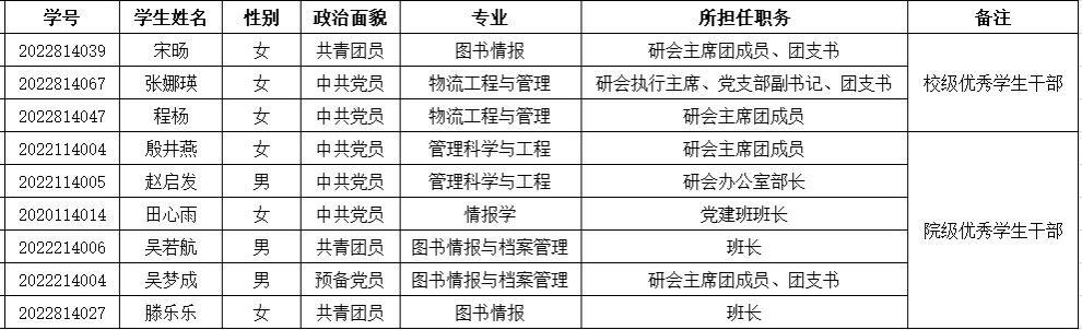 根据《南京农业大学研究生奖助体系实施方案》(校研发〔2021〕175 号)等文件精神,经个人申请、学院评审等环节,现将2022-2023学年信息管理学院优秀研究生干部名单公示如下: