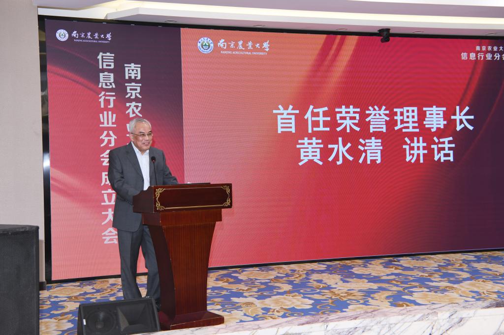 校友会信息行业分会首任荣誉理事长黄水清致辞。黄水清对为校友会信息行业分会顺利举办做出努力的各级校友、学院负责人以及学校领导表示由衷的感谢,在加强信息行业校友交流和共谋学院创新发展方面提出殷切希望。