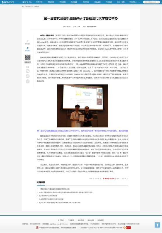 9月27日,【中国社会科学网】报道乐竞体育平台官方网站王东波教授团队主导组织的全球第一届古代语言机器翻译研讨会成功举办。