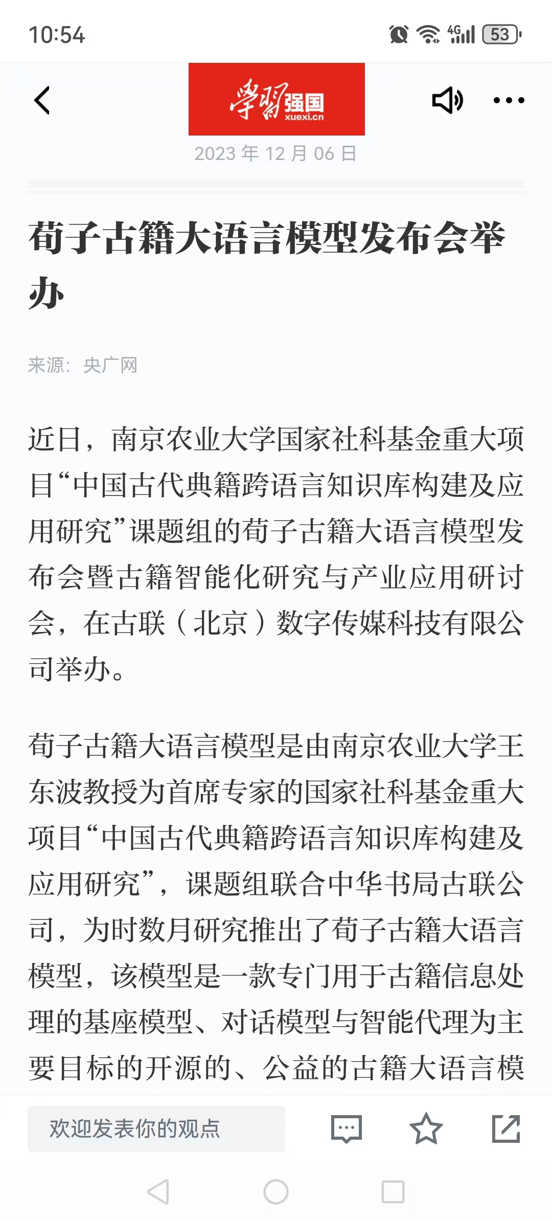 近日,学习强国报道乐竞体育平台官方网站王东波教授团队发布荀子古籍大语言模型。