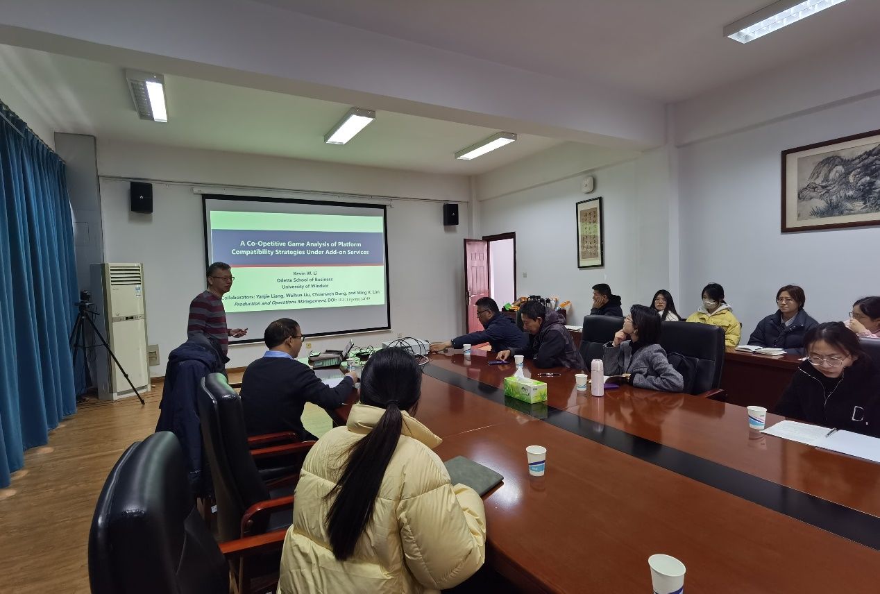 12月13日下午,加拿大温莎大学Odette商学院李武教授应学院邀请,于育贤楼C402做了题为《A Co-Opetitive Game Analysis of Platform Compatibility Strategies Under Add-on Services》的学术讲座。讲座由信息管理学院江亿平教授主持,学院师生40余人参加了此次讲座。江亿平教授热烈欢迎李武教授莅临学院进行学术指导,并简要介绍了李武教授的学术研究与学术影响。