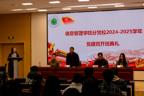 为加强乐竞体育平台官方网站分党校党建班建设工作,提高学员党性思维、端正入党动机,加强滨江校区与浦口校区两校区相融合,信息管理学院分党校党建班于11月20日下午5:40,通过在滨江校区信管楼一楼报告厅线下学习与在浦口校区汇贤楼D201线上转播的方式隆重举行2024-2025学年开班典礼。本次开班典礼由乐竞体育平台官方网站党建班班长杨颖主持,出席的领导老师有:信息管理学院党委书记郑德俊老师、信息管理学院专职组织员张鸣老师、信息管理学院辅导员蒋乐畅老师、信息管理学院辅导员靳一琳老师。