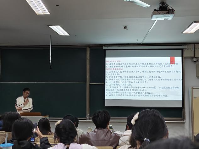 首先由王志文同学阐述发展党员流程,详细的讲述入党启蒙、积极分子、发展对象、预备党员以及正式党员这几个重要阶段的流程。并强调成为党员需持之以恒、不懈努力,鼓励同学们要坚定信念,在学习和工作中全力以赴,争取早日加入中国共产党。随后,王志文同学进一步讲解了入党流程中可能遇到的问题,包括各个阶段的发展条件、所需时间、准备材料、其它准备工作以及注意事项等内容。最后,给提出问题的同学答疑解惑,确保每位同学都能对入党流程和要求有清晰的了解。