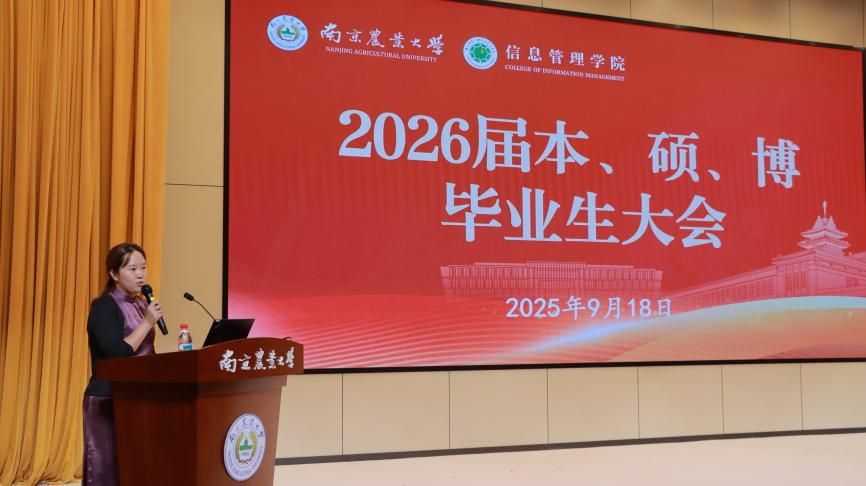 2025年9月18日14:00,信息管理学院在滨江校区会议中心阶梯报告厅召开2026届毕业生大会。学院党委副书记孙国成、学校就业指导中心主任周建鹏、教务秘书秦可蓉、辅导员郑澍坤、李孔一及全体2026届本硕博毕业生参会。会议由院学工办主任姜晓玥主持。