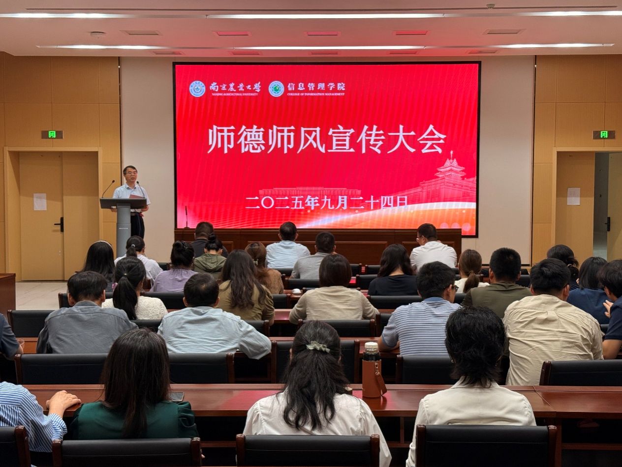 会议由学院党委书记郑德俊主持。郑德俊带领大家集中学习了习近平同志《论教育》的关键要点、党员教师应该遵守的“六大纪律”,并就各基层党支部、各系(部)联合开展师德师风教育工作提出了要求。院党委副书记、院长张兆同围绕教育部《新时代高校教师职业行为十项准则》进行了解读与分析。院党委副书记孙国成通报了国内部分高校发生的师德失范问题和师德师风违纪案例,引导教职工以案为鉴、以案明纪,并就学校发布的《南京农业大学教师师德师风负面清单》进行了宣传。副院长王东波围绕人工智能时代如何做一个与时俱进的合格教师进行了引导发言。本次大会是学院“师德师风宣传月”活动过程中的一次集中教育。通过会议交流,将进一步在教职工中强化“立德树人”的根本信念,明确教师“以德立身、以爱施教”的责任使命,推进学院教师在未来的教研活动中,以赤诚之心、奉献之心、仁爱之心投身教育事业。