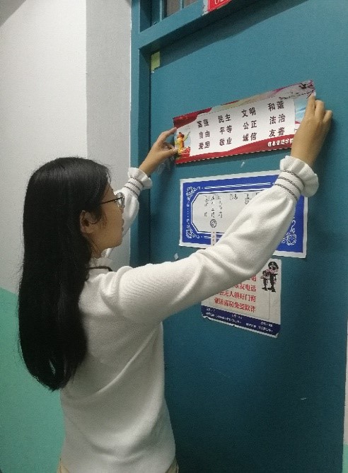十一月初,信管院学生会生活服务部在辅导员吴沐原的指导下,积极策划并组织了“携手核心价值观,青春共筑中国梦——红色标语进宿舍”活动,把社会主义核心价值观融入学校社区,转化为学生的情感认同和行为习惯。