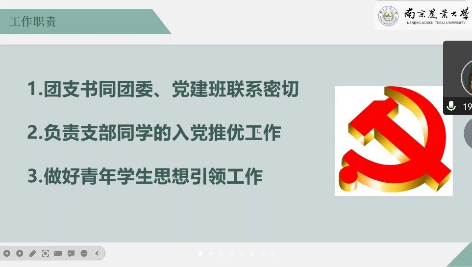 接下来是院团委宣传教育部李班同学对团支书事宜进行讲解。首先她指出团支书应同团委、党建班联系密切,负责好支部同学的入党推优工作,做好青年学生思想引领工作。然后强调了对于工作通知发布的注意事项,对主题教育和入党相关工作做出总结和工作部署,就未来工作的开展进行说明。
