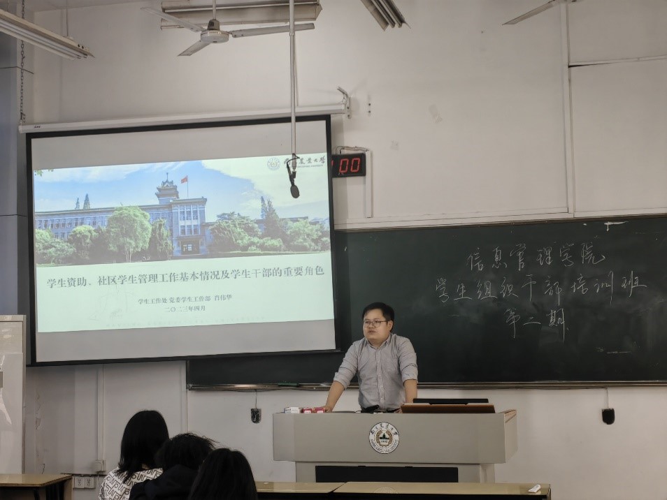 为建设信息管理学院良好学生组织队伍,培养一批优秀的学生干部,促进学生工作的顺利开展、充分发挥学生组织的自主职能,乐竞体育平台官方网站于月4月12日下午2:00举办了信息管理学院第四届学生组织培训班第二次培训。大会由肖伟华老师主持,主要阐述了学生资助和社区学生管理工作及学生干部的重要角色。