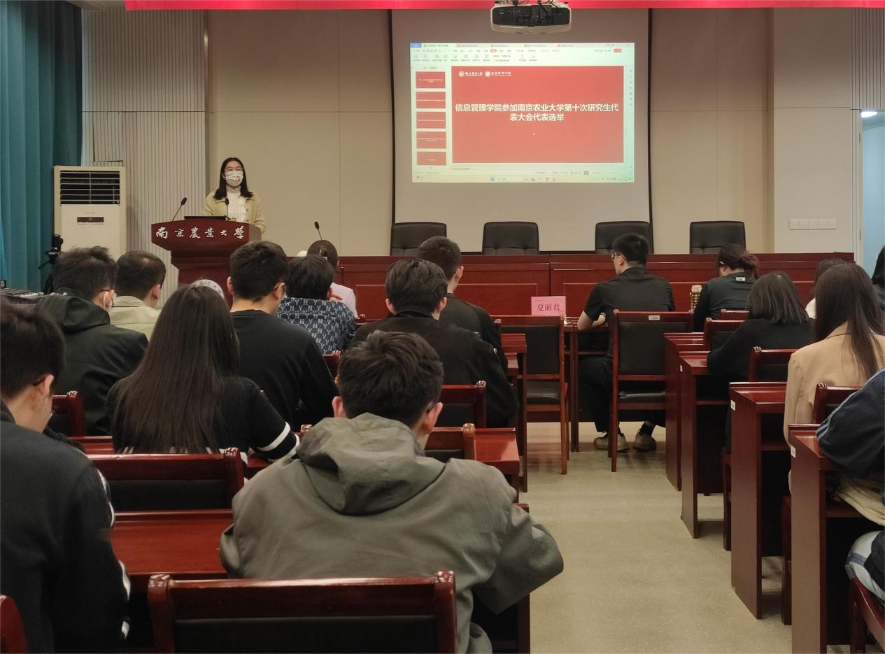 本次大会选举产生第四届信息管理学院研究生会主席团成员:张娜瑛、宋旸、程杨;选举产生南京农业大学第十次研究生代表大会信息管理学院代表:吴梦成、宋旸、孙世琦。