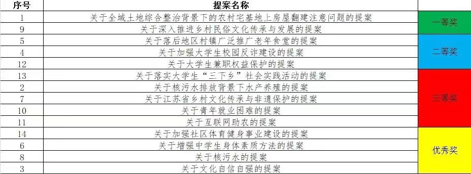 提案上交完成后,于10月30日通过各学生组织推选出来的评审团对提案投票评选,综合授予一等奖两名、二等奖三名、三等奖五名、优秀奖若干,以下是本次模拟政协提案大赛的获奖情况。同时,陆熠同学的《关于深入推进乡村民俗文化传承与发展的提案》已经被推荐至共青团江苏省委参与评选。